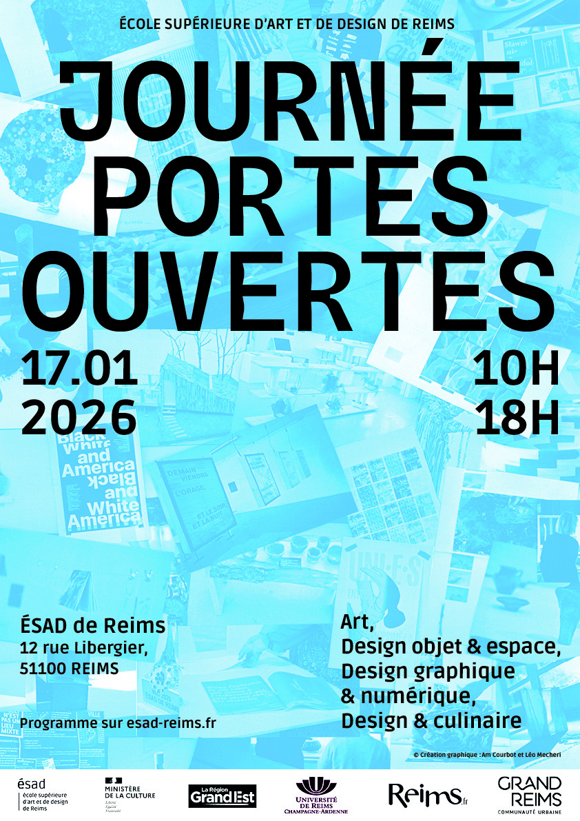 L’ÉSAD invite ses (futur·e·s) étudiant·e·s, leur famille et autres passionnés d’art venant de toute la France et d’ailleurs à participer à sa Journée Portes Ouvertes samedi 17 janvier 2026, de 10h à 18h, au 12 rue Libergier. L’occasion de s’informer, de faire de riches rencontres et de découvrir une grande exposition d’art et de design à tous les étages…