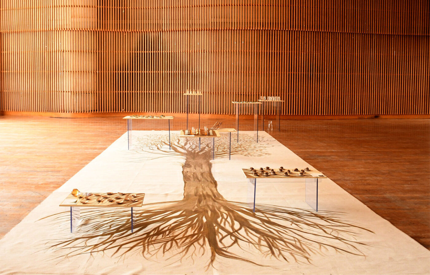 J’invite le public à déambuler dans cette scénographie pour y découvrir des traductions culinaires illustrées : l’absorption de l’eau avec l’osmose, les étapes de croissance du bois, la croissance du bourgeon avec l’auxine, le cycle de l’eau avec l’évapotranspiration, la timidité des cimes, la relation entre eux avec l’allélopathie, la décomposition de la matière végétale avec la cladoptose et l’humus.